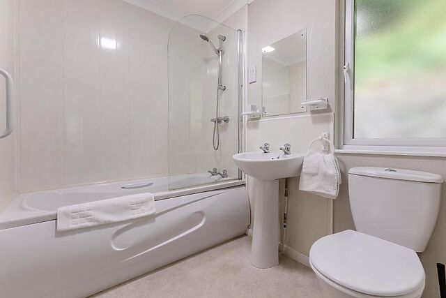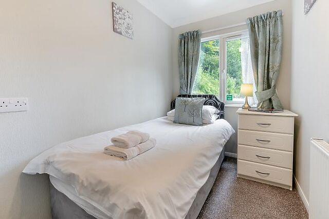 The lodge boasts two restful bedrooms: a spacious double and a peaceful single room – ideal for a solo guest or younger traveller. A contemporary family bathroom with WC adds further convenience, making this a comfortable and well-equipped retreat.