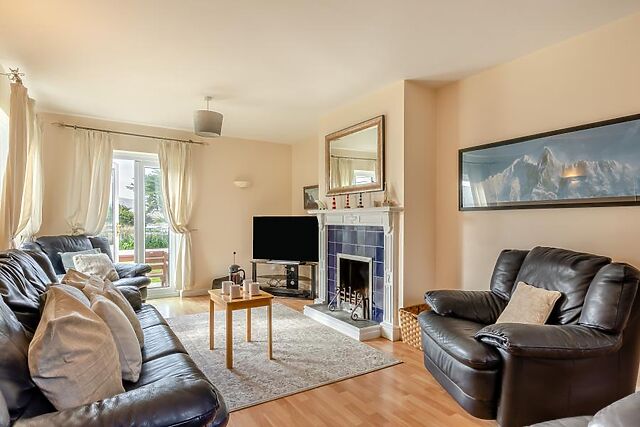 Step inside to a welcoming entrance hall leading to a stylish lounge, where an open fire and plush leather seating create the perfect ambience to unwind together. French doors open onto the garden.