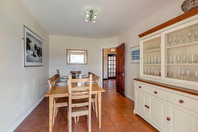 This lounge connects to a cosy ground-floor bunk room. Upstairs, you’ll find five bedrooms with views of the countryside: one en-suite king-size connecting to a bunk bedroom, one double bedroom, one twin room, and another bunk room offer plenty of choice for sleeping arrangements.