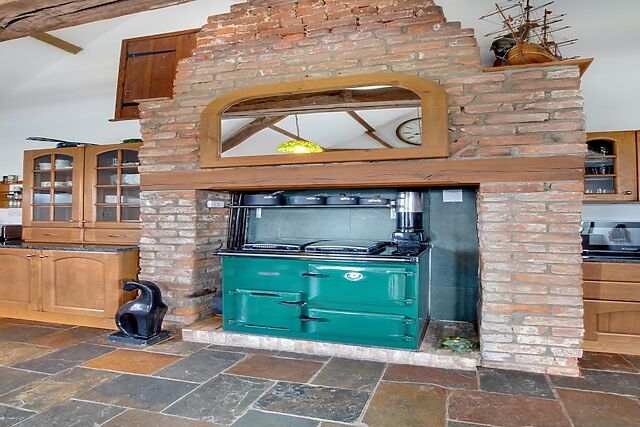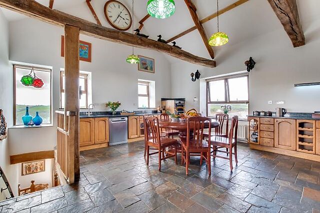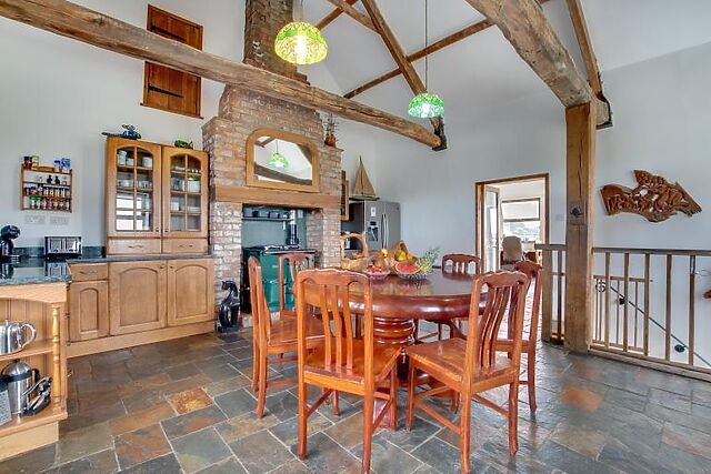 The farmhouse is steeped in history, with parts dating back to before the Domesday Book. The main living space includes a vaulted oak-beamed kitchen, a large dining room with bi-fold doors opening onto a furnished patio, and a cosy seating area with a wood burner.