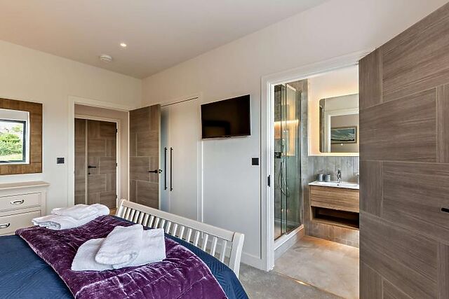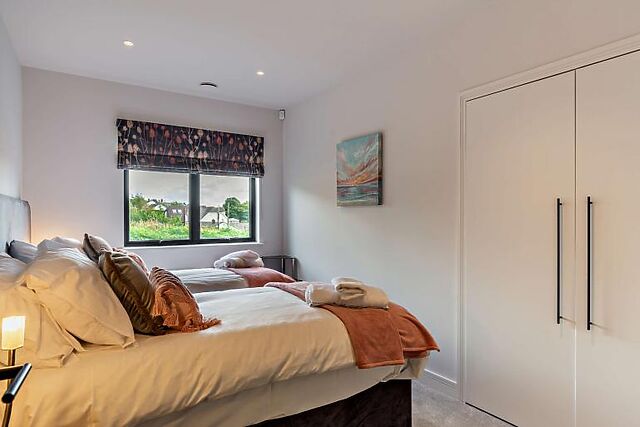 The accommodation includes four beautifully styled bedrooms: two doubles, one twin, and a master with a king-size bed and en-suite shower room. Each bedroom offers ample wardrobe space, and the family bathroom features a rainfall shower over the bath.