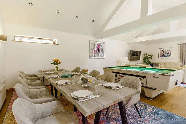 The property boasts a light and airy lounge with a smart TV and pool table, leading out to a secluded courtyard garden. The kitchen is fully equipped, catering to all your culinary needs.