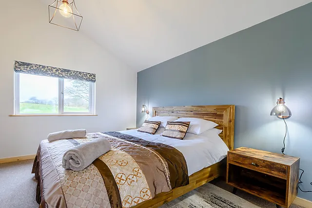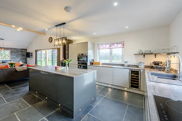 Inside, the open-plan living space with a vaulted ceiling and wood burner offers a warm welcome. The kitchen is equipped with modern appliances, making it a delight to prepare meals.