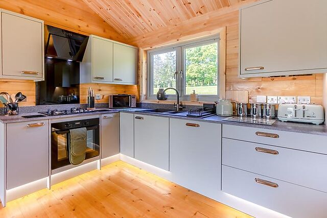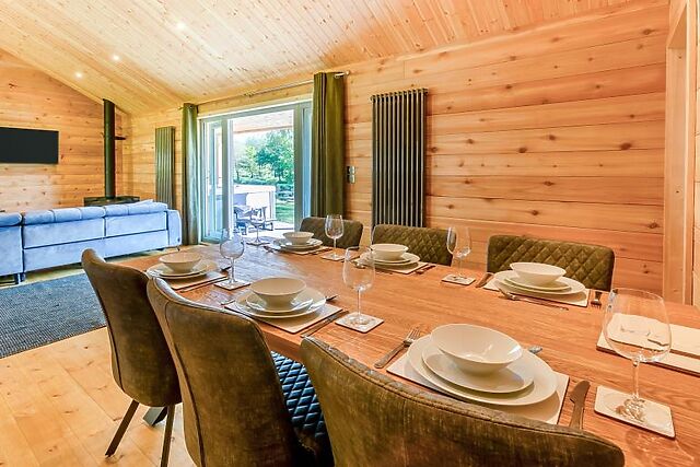 Accommodating six guests over three bedrooms, this lovely wooden property suits families and small groups perfectly. On arrival, step through the French doors and into the lodge's bright and airy open-plan living area, where the lounge, dining space and kitchen all flow together.