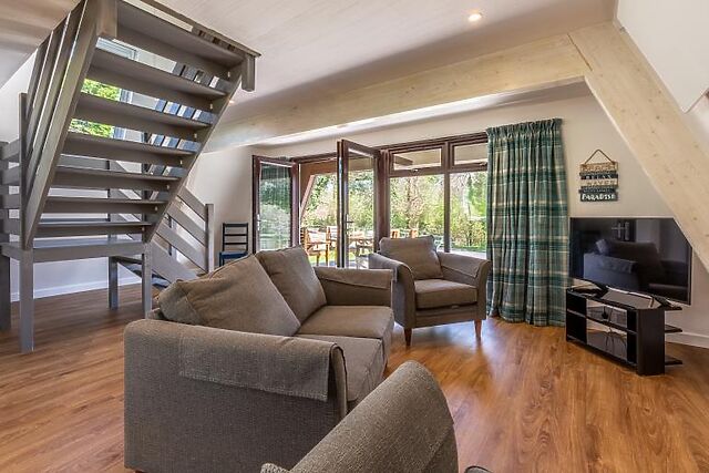 Upstairs, you will find a double bedroom and a twin bedroom, both designed for a restful night's sleep. The lodge also includes a bathroom with a shower over the bath, ensuring all your needs are met.