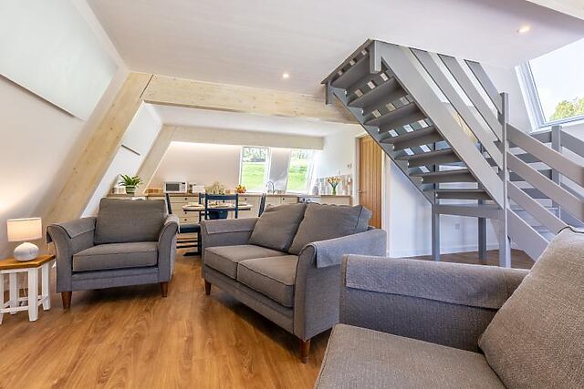 Step inside the open-plan living area, where you can unwind on the plush sofa and armchairs while enjoying your favourite shows on the Smart TV.