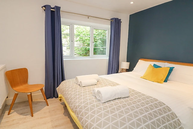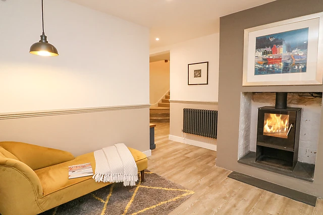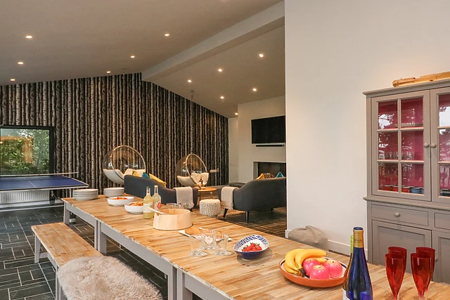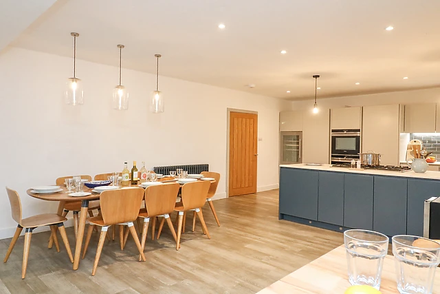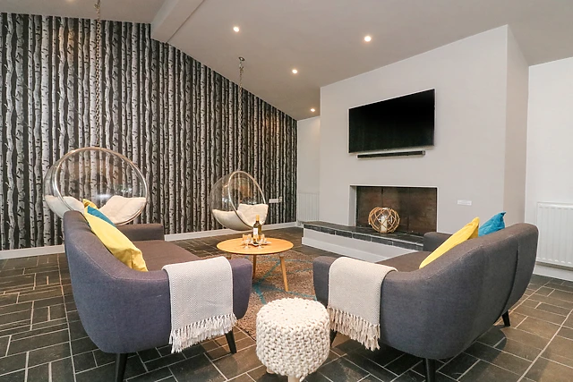 Designed with an open-plan living space, the cottage encourages communal dining and leisure, while the separate sitting and large TV rooms provide ample space for unwinding. The warmth of the woodburning stove complements the modern amenities, creating a cosy yet contemporary atmosphere.