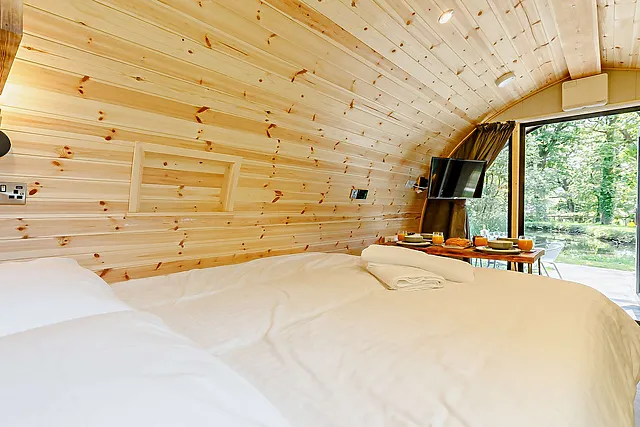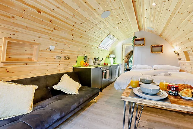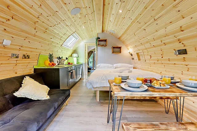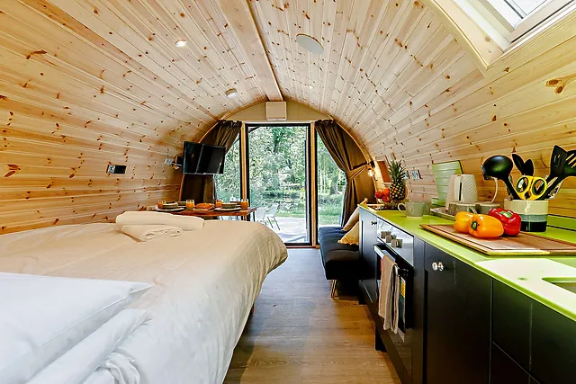 Indulge in the luxury of your own private hot tub, where you can unwind and soak up the serene lake views. The pod's emphasis on relaxation is evident throughout, from the variable mood lighting to the stylish studio layout.