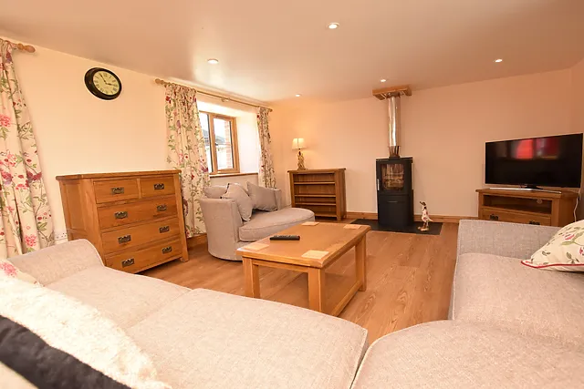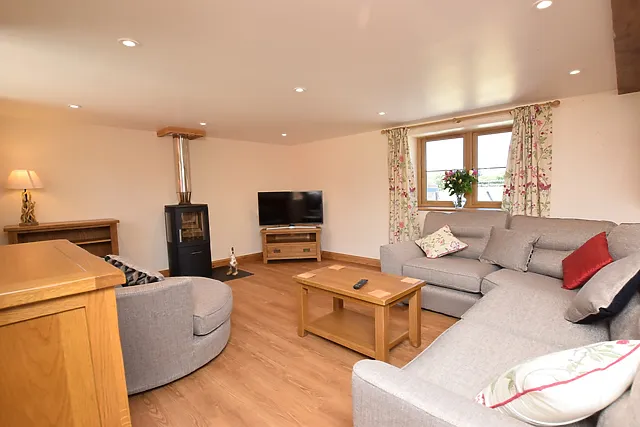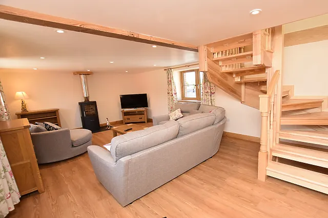Inside, the open-plan lounge/kitchen/diner is equipped with all the modern conveniences you could need, complemented by a wood burner for those cooler evenings. The enclosed garden with its patio and lawn area is perfect for al fresco dining or simply soaking up the peaceful farm atmosphere.