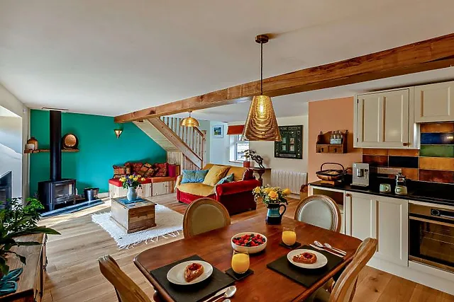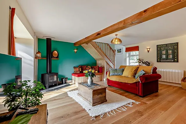In the evenings, soak in the relaxing wood-fired hot tub or toast marshmallows around the firepit. The striking holiday home has been exquisitely decorated and furnished, featuring elegant exposed woodwork, vibrant soft furnishings, and colourful paintwork.