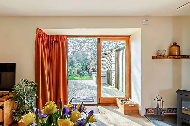 A contemporary bathroom completes the accommodation. Outside, the garden is a haven of tranquillity, with a luxurious wood-fired hot tub on the decking area, surrounded by magical outdoor lighting to really set the mood.