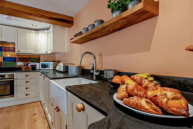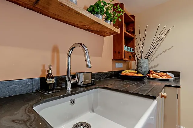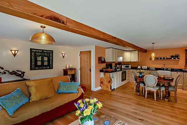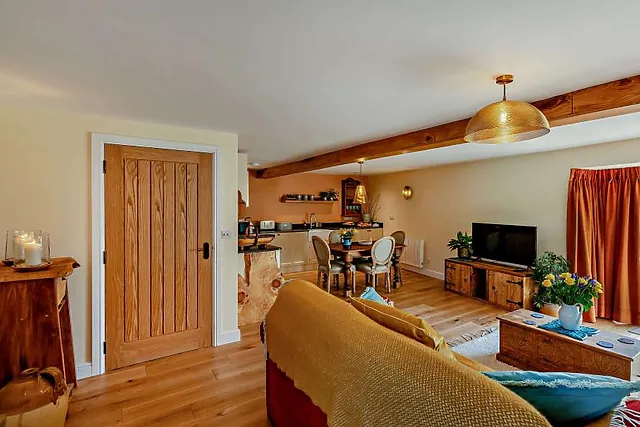 The open-plan lounge/kitchen/diner is a bright and airy space where you can prepare home-cooked feasts in the stylish kitchen area and share mealtimes at the wooden dining table. At night, snuggle up on the sofa to watch the Smart TV in the glow of the wood burner.