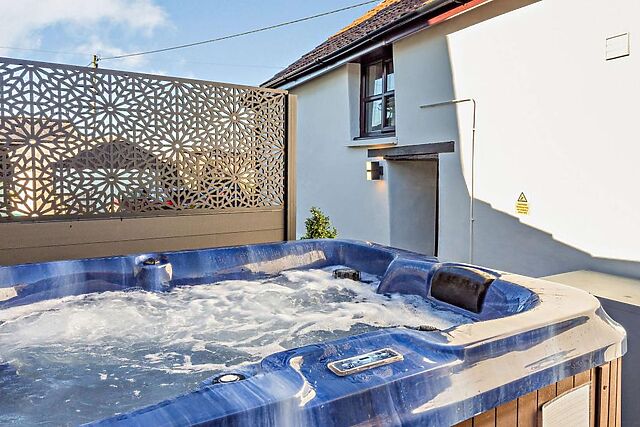 Yes, the property features a private hot tub located on the enclosed decked patio, providing guests with a luxurious and relaxing experience during their stay.