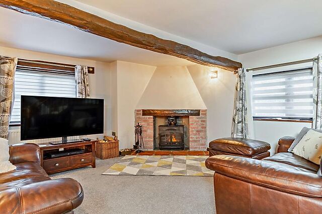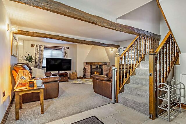 The open-plan living space, complete with a woodburner and smart TV, ensures a cosy and comfortable stay.