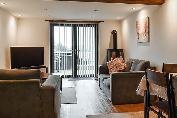 Twin sofas and an electric wood-burning stove make the open-plan lounge a great space to relax after a day outdoors.
