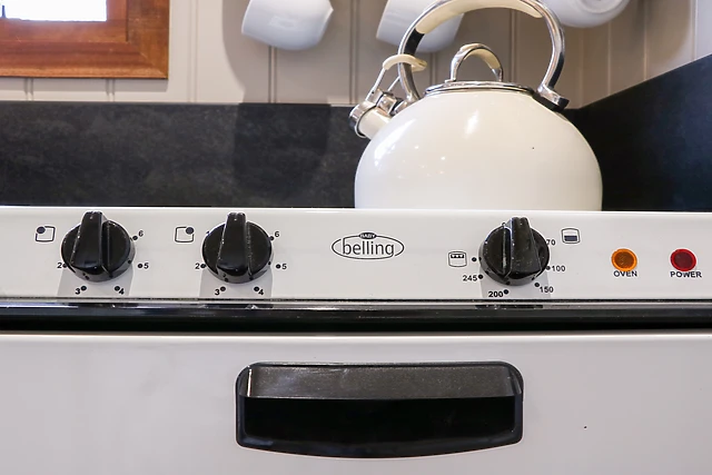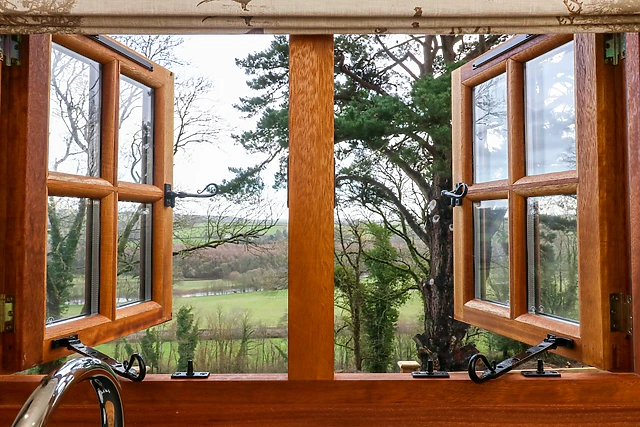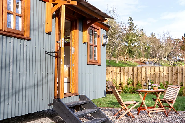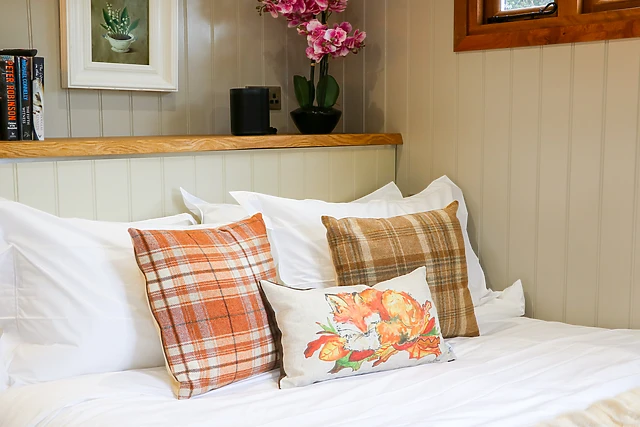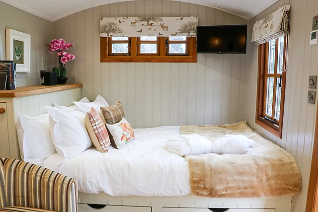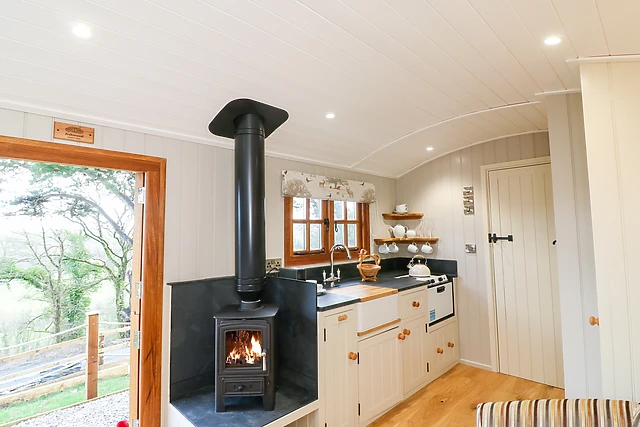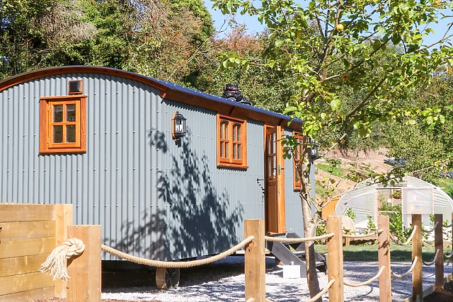 Little Silver Fox Silvery Grey in colour, this beautiful shepherds’ hut sits midway within the orchard, perfectly positioned to enjoy the magnificent views of the valley below. Step inside to the studio style accommodation with luxury king size bed, seating area with foldaway table and kitchen fitted with Belling electric cooker and hob, Smeg fridge and wood burning stove.