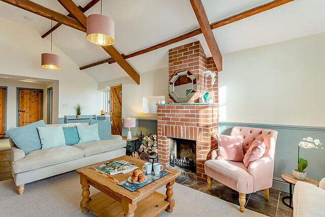 A cosy barn conversion set over two storeys, this delightful property has been carefully designed with high-quality furnishings to complement its stunning original features, which include rugged beams, vaulted ceilings and an exposed-brick fireplace. Step through the front door and into the L-shaped lounge, where you can relax in the plush sofas around an open fire and enjoy some relaxing family time, perhaps streaming a favourite show on the Smart TV.
