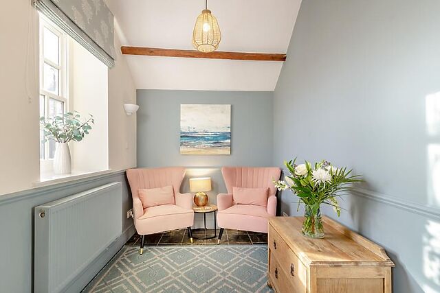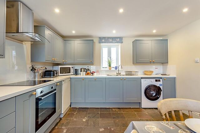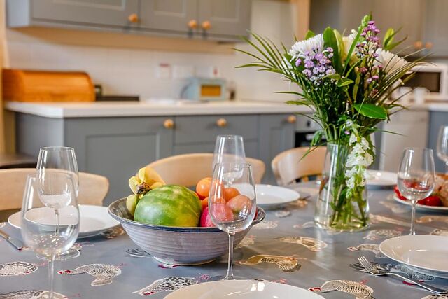 Tucked around the corner is a nook that’s perfect for quiet moments with a good book, or to set up as a children’s play area. The farmhouse-style kitchen/diner is another wonderful space, with a long dining table, a stylish kitchen and plenty of cooking equipment, including a microwave and a dishwasher.
