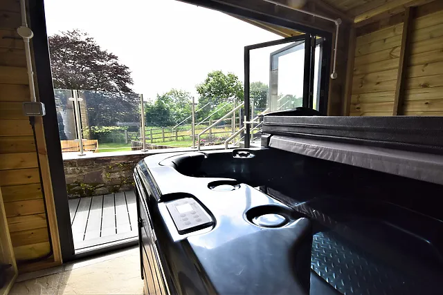 Yes, the property features a fabulous private hot tub enclosed within a purpose-built hut with bifold doors, allowing guests to enjoy the countryside view in any weather.