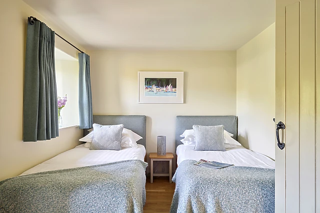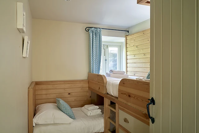The accommodation features three cosy bedrooms, including a ground-floor twin with an en-suite, a cabin-style twin perfect for children, and a snug double room.
