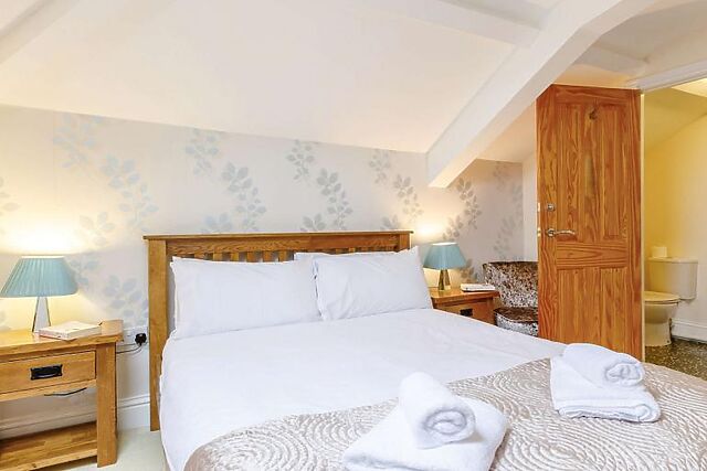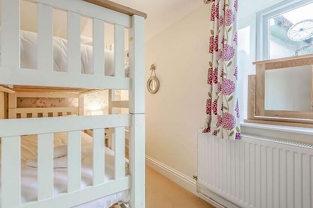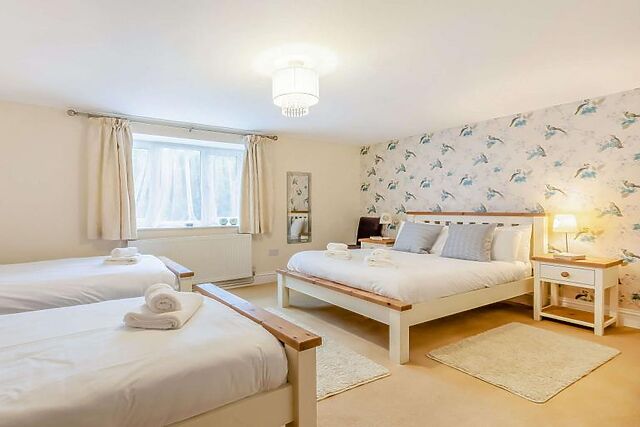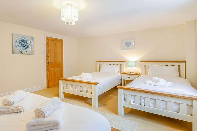 The cottage boasts four bedrooms, accommodating up to 10 guests. It includes a family bedroom with a double and twin beds, a double bedroom with an en-suite, and two bunk bedrooms.