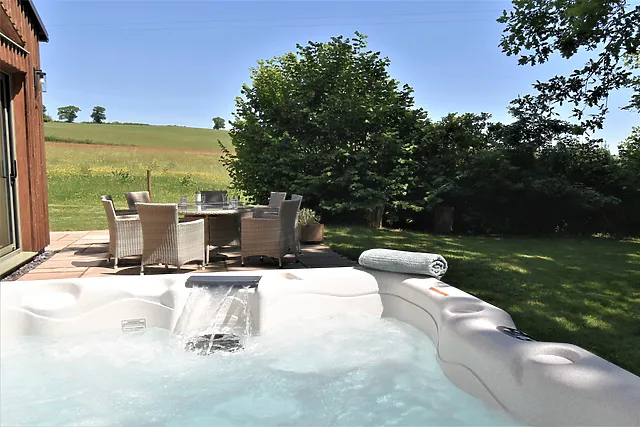 Yes, the property features a private hot tub for guests to enjoy. It is situated on the patio area, offering a relaxing experience with views of the surrounding countryside.
