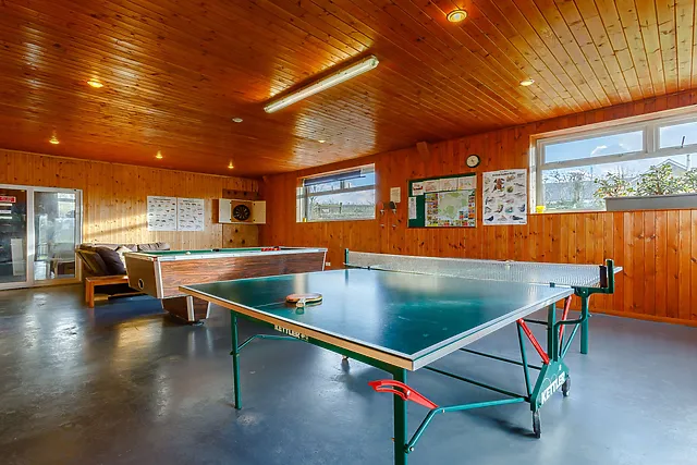 Guests have access to shared facilities including an indoor heated swimming pool, a sauna, a games room with various activities, and a laundry room with washing machines and tumble dryers.
