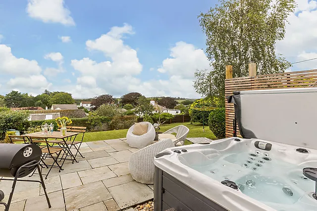 Yes, the property features a private hot tub that offers picturesque views, providing guests with a luxurious spot to relax and unwind during their stay.
