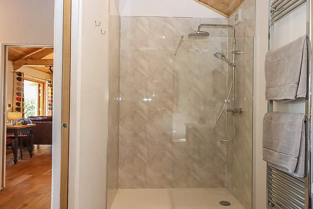 Inside, you will find an airy, open-plan living space featuring a vaulted ceiling, fully-fitted kitchen providing everything you need for a self-catering stay, including a slimline dishwasher and Nespresso Vertuo coffee machine, a dining area with seating for two, and a lounge area with Smart TV, games, bluetooth speaker, and a woodburning stove: perfect for snuggling up in those colder months. You’ll also find a well-presented bedroom with king-size bed and superb meadow views, plus a contemporary ensuite bathroom with sumptuous waterfall shower and heated towel rail.