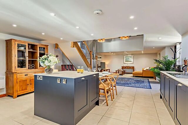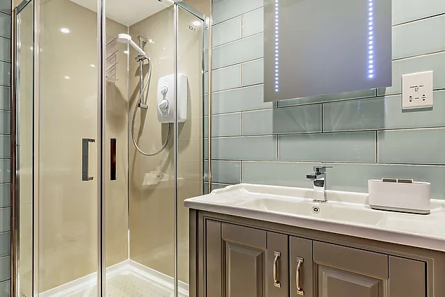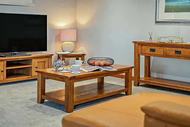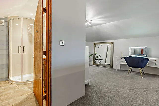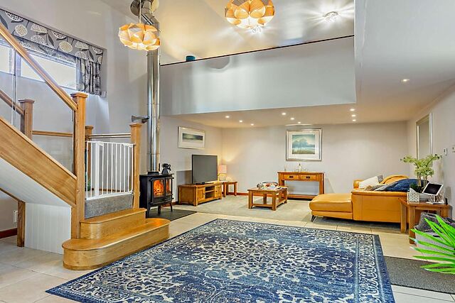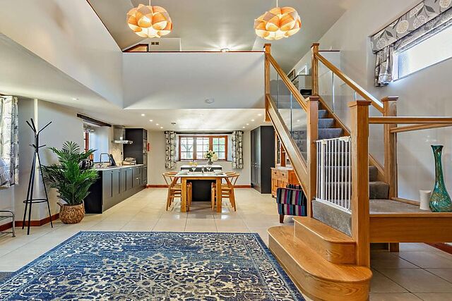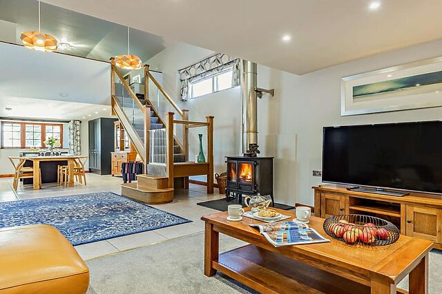The open-plan ground floor exudes contemporary charm, featuring a recliner sofa, woodburner, and a Smart TV with Netflix for cosy evenings in. The well-equipped kitchen includes an oven, hob, microwave, and even a dishwasher, ensuring a hassle-free stay.