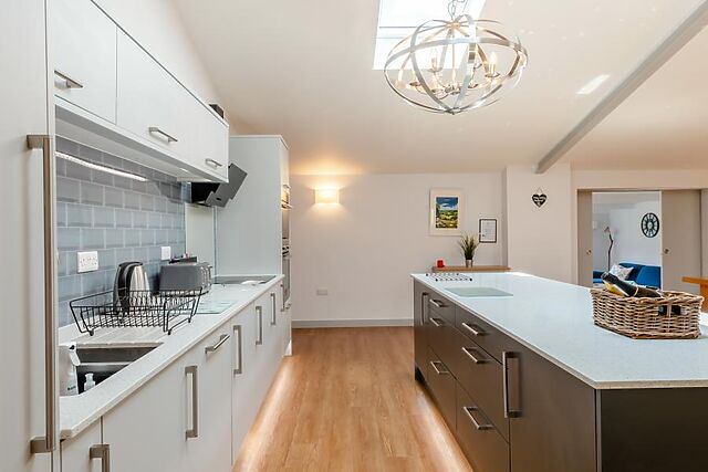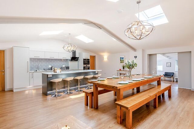 Enter this beautiful barn via a spacious entrance with a large cloakroom for coats and shoes. A couple of steps lead into the striking open-plan kitchen/diner.