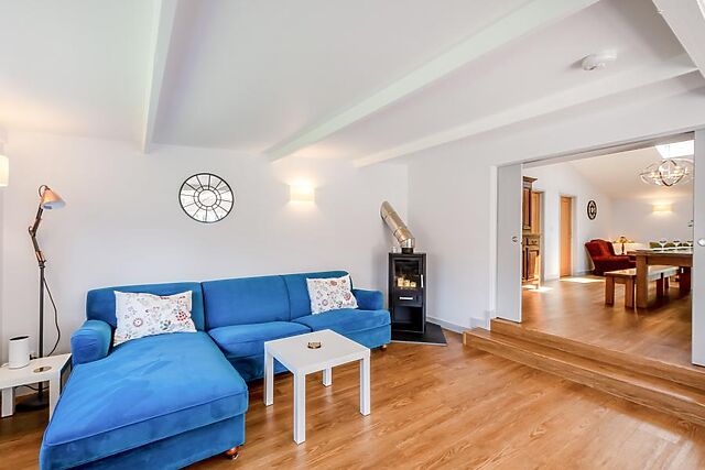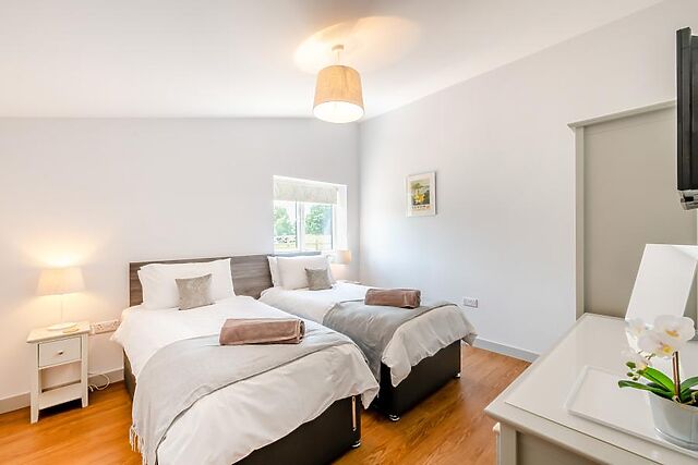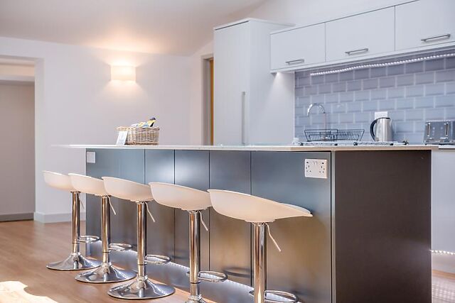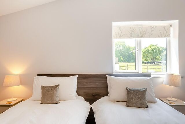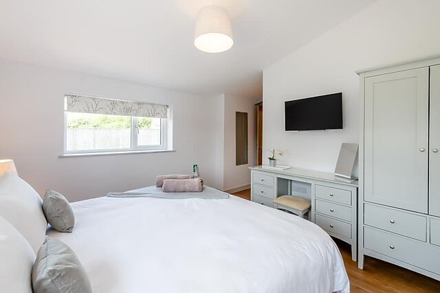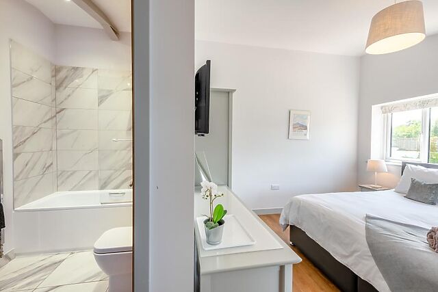 There are four king-size, en-suite bedrooms with Smart TVs. An inviting lounge invites with comfortable seating, a wood burner and a Smart TV for movie nights.