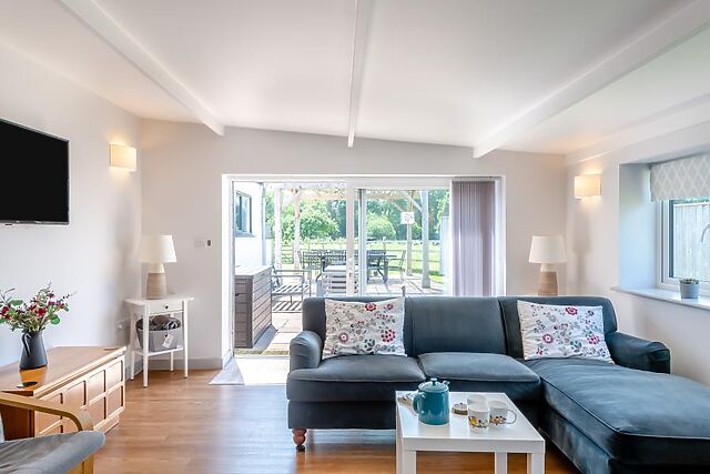 There are patio doors leading to the outdoor spaces. On balmy evenings, unwind on the patio in the enclosed garden overlooking the meadow or enjoy stargazing from the hot tub.