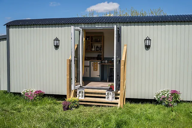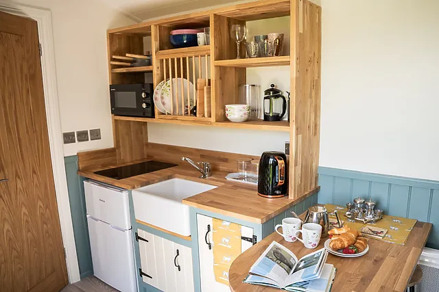 The interior features a cosy king-size bed, a smartly-equipped compact kitchen, and an en-suite shower room. Thoughtful touches such as bathrobes and a Smart TV ensure a comfortable stay. The shepherd's hut is nestled within an enclosed garden, offering privacy and uninterrupted views of the surrounding fields.