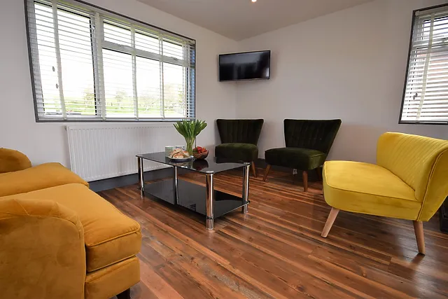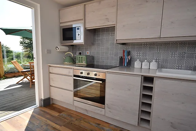 The heart of this retreat is an open-plan living space, complete with a snug lounge area, a Smart TV, and a wood burner for those cooler evenings. The kitchen is fully equipped, ensuring a seamless self-catering experience.