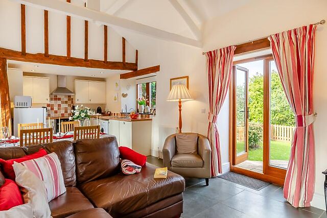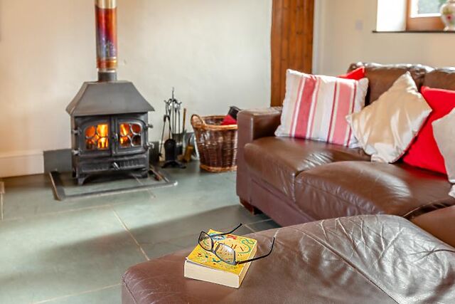 The spacious living area features a large L-shaped sofa and a wood burner, creating a cosy atmosphere. The open-plan kitchen/diner ensures that those preparing meals can still join in the conversation.