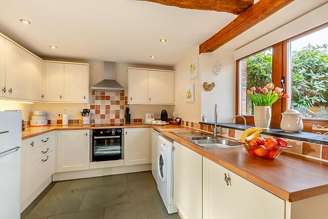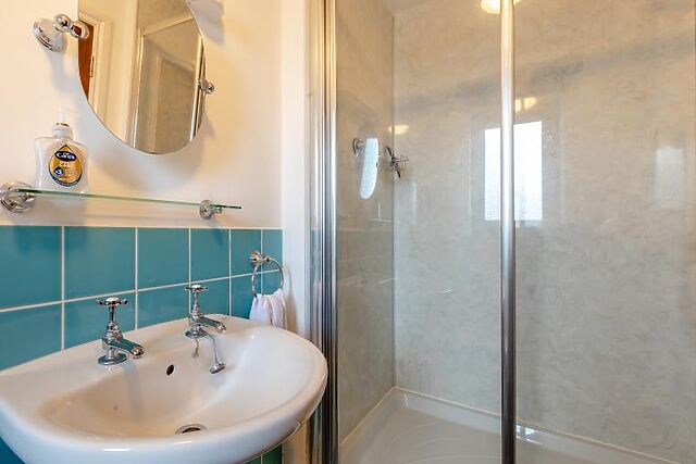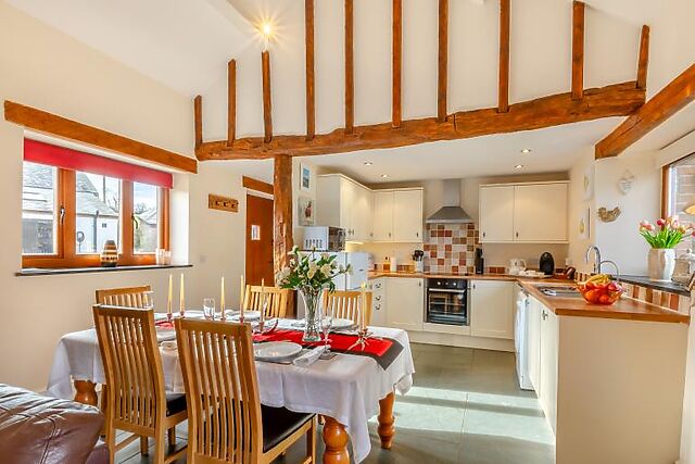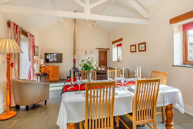 The spacious living area features a large L-shaped sofa and a wood burner, creating a cosy atmosphere. The open-plan kitchen/diner ensures that those preparing meals can still join in the conversation. The main bathroom boasts a luxurious roll-top bath and a separate walk-in shower.