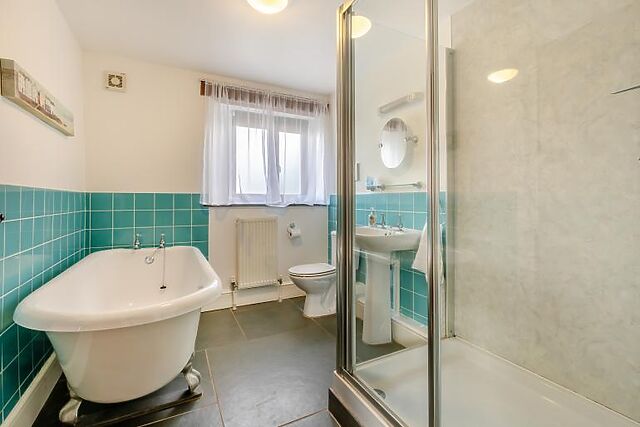 The main bathroom boasts a luxurious roll-top bath and a separate walk-in shower.