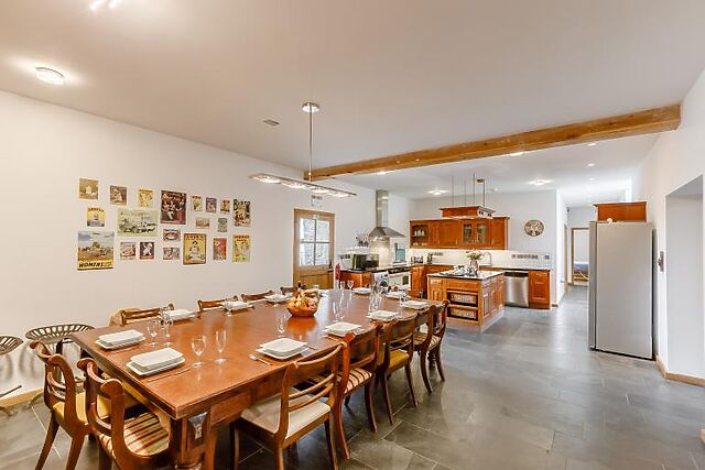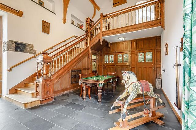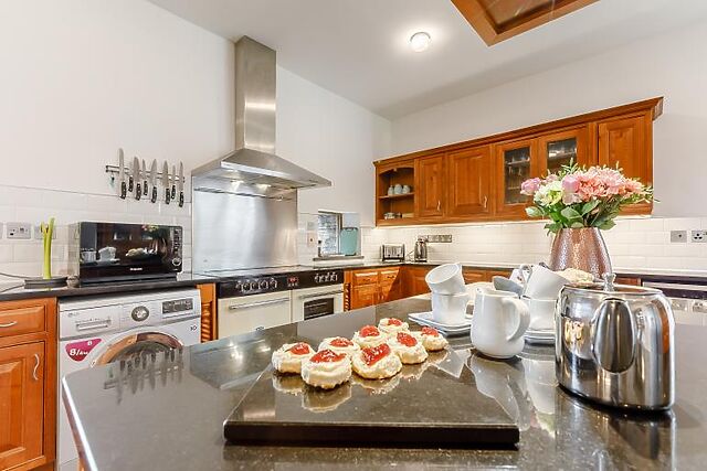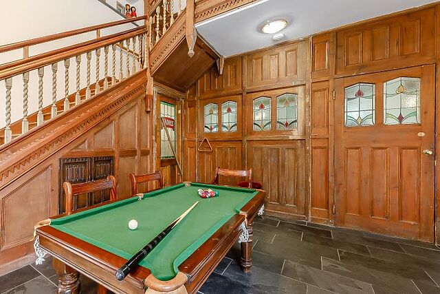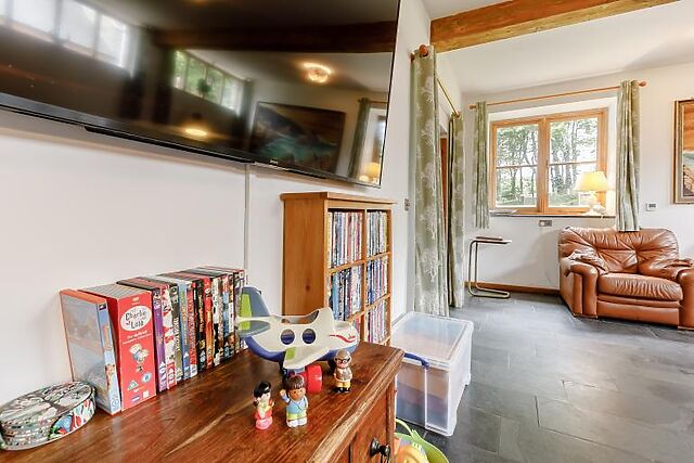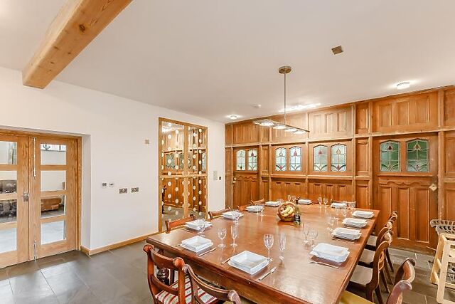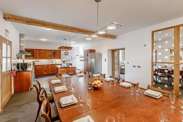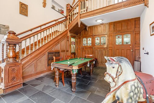 Inside, you'll find a characterful Great Hall with an inglenook fireplace, vaulted roof, and log burning stove. The snug lounge offers a peaceful retreat with a TV and plenty of seating. The 30ft kitchen/dining room is perfect for large gatherings, featuring state-of-the-art facilities and a large wood dining table.