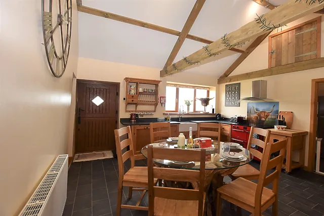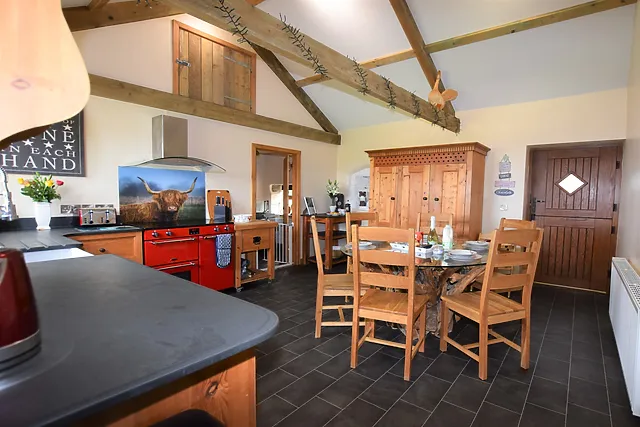 The accommodation boasts a private hot tub, where you can soak under the stars, and a large garden with play equipment for children. The interior features exposed beams and luxurious touches, ensuring a stay that combines the best of country living with contemporary amenities.