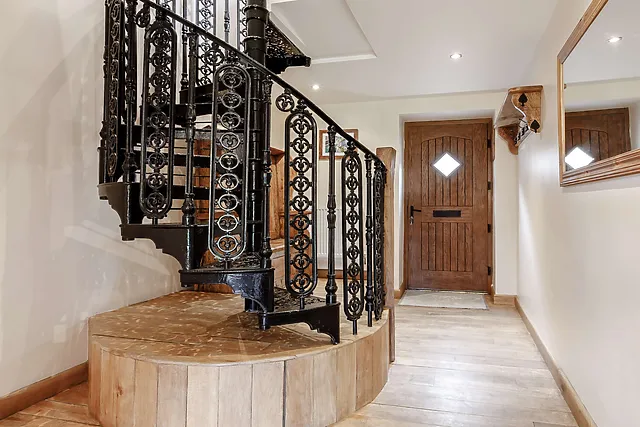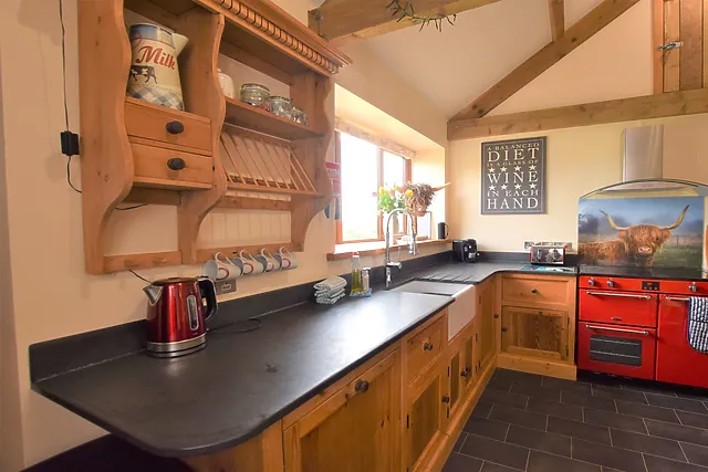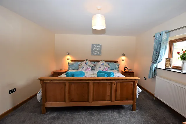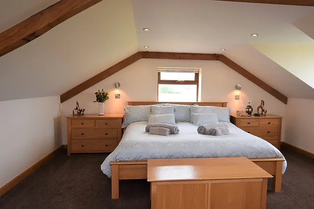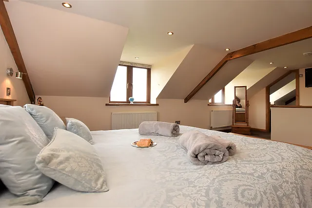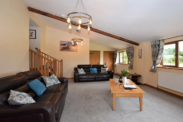 The interior features exposed beams and luxurious touches, ensuring a stay that combines the best of country living with contemporary amenities.