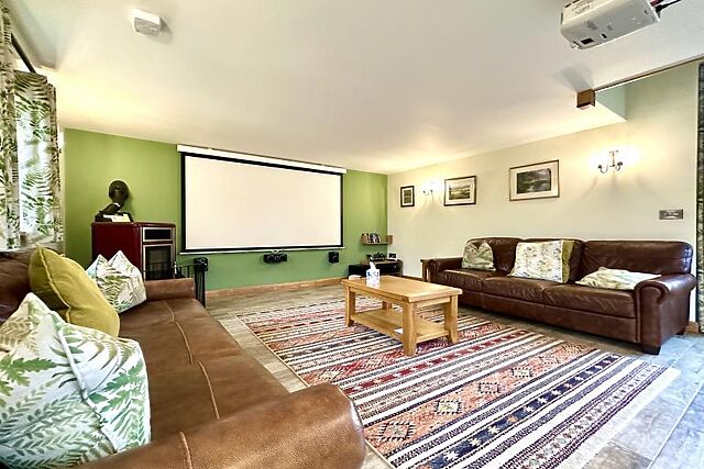 Step into the light and airy open-plan kitchen/diner, equipped with modern appliances, and a dining table perfect for family meals. The living room invites you to unwind on comfortable leather sofas while enjoying a movie night on the cinema-style projector screen with smart features.