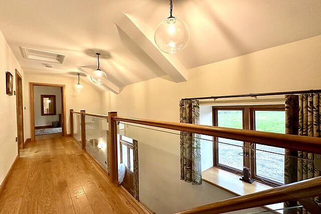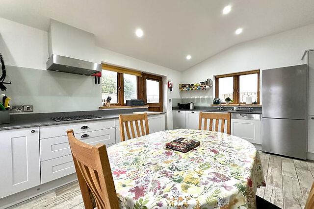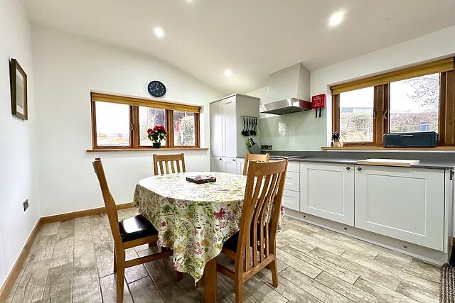 Outside, the enclosed patio area offers stunning countryside views, a private hot tub, and comfortable seating for al fresco dining or morning coffee. The tranquil setting is ideal for relaxation after a day of exploring.