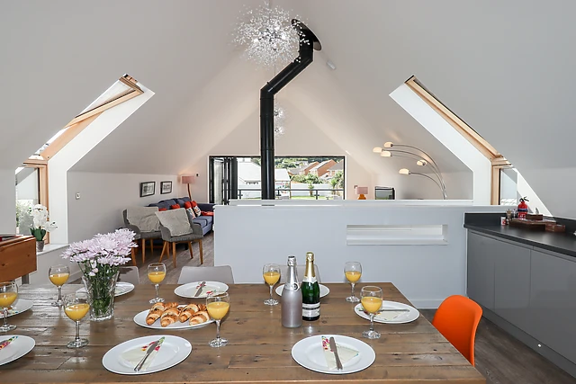A reverse-level home, Pebble Ridge View features five elegant bedrooms located on the ground-floor, comprising a super-king-size with Smart TV and en-suite shower, a king-size with en-suite shower, a double and a twin with Smart TVs, and a bunk, along with a communal bathroom for your convenience. Climb up to the first floor, where you will discover tastefully presented open-plan living space with vaulted ceiling, complete with a fully-equipped kitchen, a dining area and an inviting sitting area with woodburning stove, ideal for cosy nights in with your loved ones.
