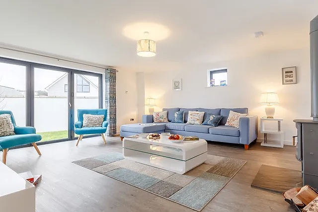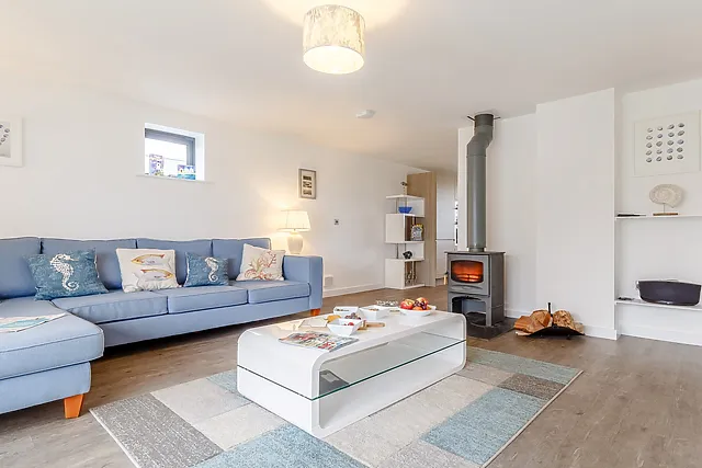 The open-plan living space, complete with a wood burner, offers a cosy ambience, while the enclosed garden provides a serene spot to enjoy the outdoors.