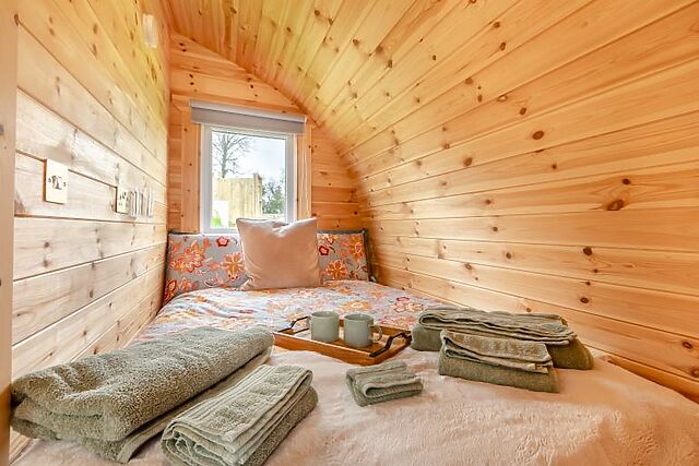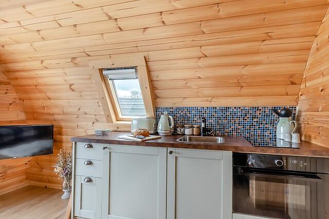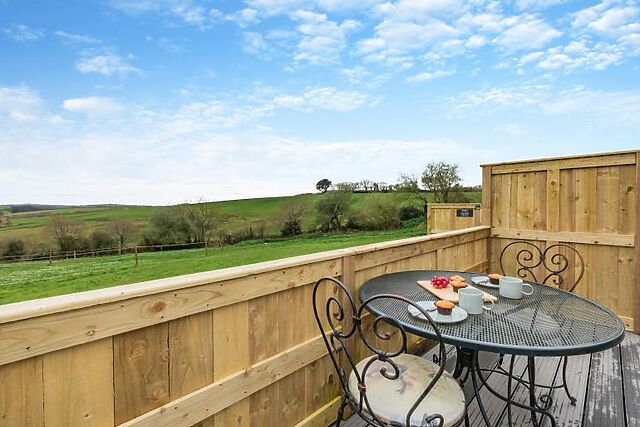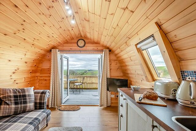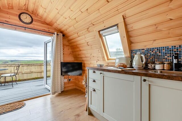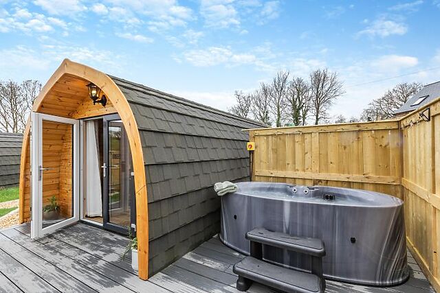 One of the highlights of Pod Olive is the private hot tub on the terrace, where you can unwind while taking in the stunning views of the rolling fields.