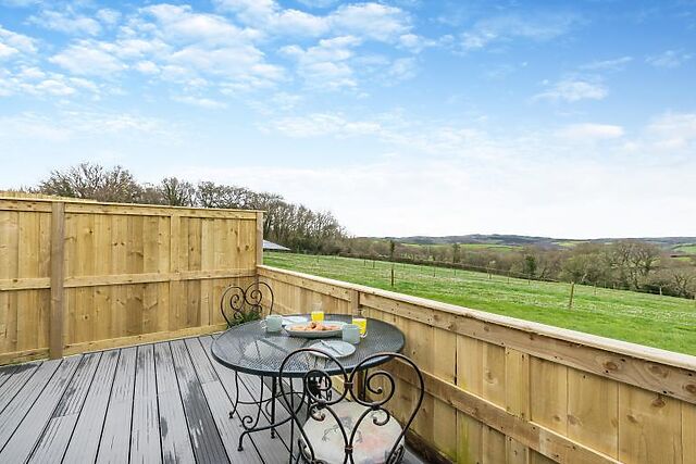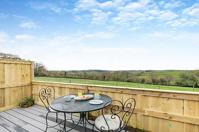 Step outside onto the terrace and enjoy al-fresco dining with panoramic views of rolling fields. After a day of exploring, unwind in your private hot tub and soak in the serene surroundings.
