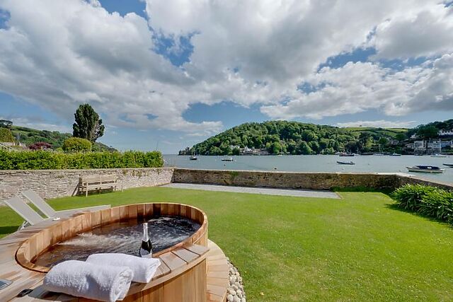 The property boasts a multi-level terraced garden with various areas for relaxation and entertainment. Enjoy al fresco dining with stunning river views, lounge on the sunbeds, or unwind in the luxurious hot tub.