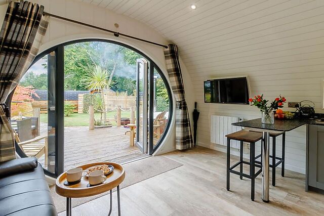 The pod is beautifully furnished, featuring a studio-style lounge, kitchen, diner, and sleeping area with a comfortable king-size bed.