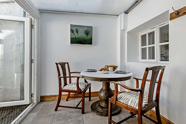 Outside, an enclosed garden with a bistro table sets the scene for alfresco dining.
